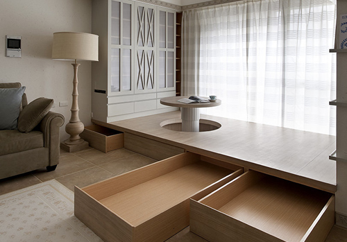 地臺是榻榻米實現(xiàn)功能的一個重要配件,所以要把地臺的高度做好設(shè)計。日式的榻榻米的地臺一般是高出地面30厘米,但在實際設(shè)計的時候可以按照業(yè)主自己的需求進行設(shè)計。