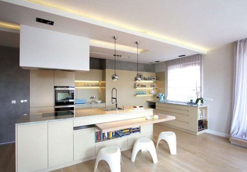 現(xiàn)代廚房的燈光設(shè)計(jì)分為兩個(gè)層面,除了對(duì)整個(gè)廚房的照明,在洗滌區(qū)和操作臺(tái)也要增設(shè)櫥柜專用射燈。這類射燈光線適度,開關(guān)方便,讓你的眼睛得到解放。