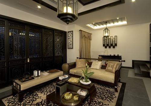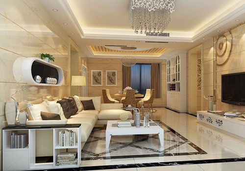 客廳是家人和親友相聚的地方,需要營造出溫暖、融洽的氣氛。圓形的燈飾、天花造型、以及裝飾品,在心理上給人以溫馨之感,也正好符合這樣的要求。